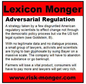 Within the scientific community, another term has been openly discussed in papers and conferences called “adversarial regulation”. Retired US regulatory scientists like Bernard Goldstein and Christopher Portier, perhaps frustrated by years of lobbyist interventions in the regulatory process, prefer the adversarial (litigation) approach of scientific advisers working with law firms to persistently sue the corporations making the targeted products or substances. According to Goldstein, this approach has proven to be more effective in changing markets and practices than the regulatory approach. It has also proven to be more profitable for the scientists involved. One small detail though is that adversarial regulation circumvents the democratic process.