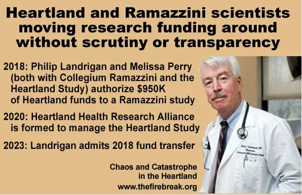 They were only able to raise about €300,000 for their Global Glyphosate Study (GGS), which held it up for several years. Head of Research at Collegium Ramazzini, Philip Landrigan, transferred almost one million dollars in 2018 as a lifeline for the GGS from money that US law firms had donated to the Heartland Health Study (that he was also directing) via his academic institution, Boston College. He only acknowledged the transfer in 2023 when new management at the Heartland Health Research Alliance informed him that his transfer was illegal and unethical.