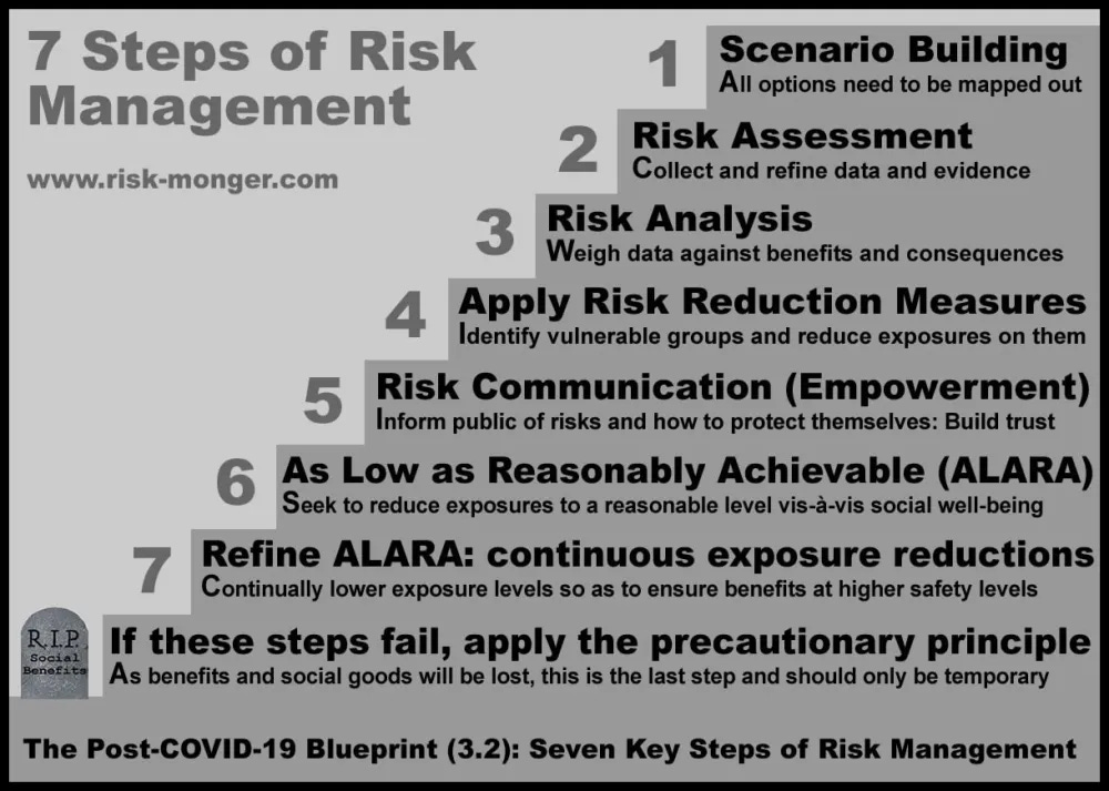 Articulation of the risk management process (see image above), moving from hazard identification to risk assessment to scenario building to risk communication to hazard reduction measures to risk-benefit analyses … and only if this process fails to provide protection, conditions for invoking the precautionary principle.
