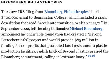 Meanwhile, someone like Michael Bloomberg can go around pretending his political meddling is just him being a patron of the academe (while deducting his activist campaign contributions courtesy of the American taxpayers). Since 2022, other large philanthropies within the left-leaning activist network (Schmidt Family Foundation, Long Ridge Action Fund…) have joined in funding Beyond Plastics via Bennington College. Source.