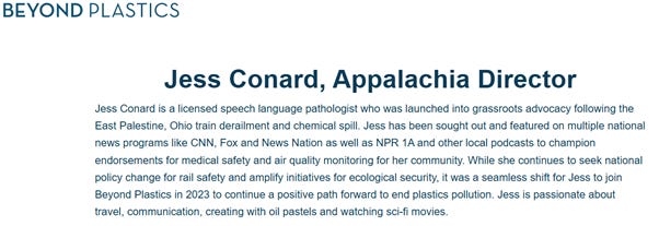 This staff description wants to portray Jess as a concerned Mom who suddenly stood up to fight when a train derailed in her East Palestine backyard. Beyond Plastics failed to mention that Conard was also involved with a Mom’s activist group, Mom’s Clean Air Force, based in New York City and “affiliated” with the Environmental Defense Fund, where she had had some broad media attention in New York and Washington before Enck signed her up to speak out against plastics following the East Palestine train derailment. In several of the press campaigns following the East Palestine accident, Mom’s Clean Air Force was involved with Beyond Plastics, including their Washington campaign in July 2023, where Conard appeared on their behalf. But Mom’s Clean Air Force was no longer part of the coalition by December 2023 after Conard signed on with Enck and co. Hmm.
