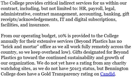 As my correspondence with Bennington College confirmed, there is no office, Beyond Plastics does not exist as a legal entity, has no 501(c)(3) status and publicly declares no budget.