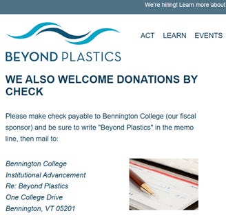 Beyond Plastics, one of the leading anti-plastics activist groups in the United States, is technically, not a registered NGO. It is operating and receiving donations via Bennington College, and the activists who work for the “NGO” use a Bennington College “.edu” email address. They even have Bennington College displayed in their logo:
