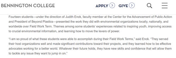 Is Enck an academic or an activist? There is a gray area here that is made worse by the college serving as the actual Beyond Plastics non-profit front group. Enck merely seems to have tied herself to Bennington for the CAPA activist incubator, access to free interns and little more.