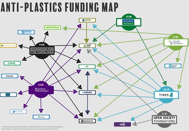 Further, it's beyond rich for Beyond Plastics to characterize the bottled water industry as a “juggernaut.” Why? Because Enck’s outfit belongs to a sprawling network of activists backed by billionaires—to the tune of about $340 million (see image below). This river of cash funds a wide variety of lobbying activities including local demonstrations, public testimony, academic research, external PR support, and fawning media coverage.
