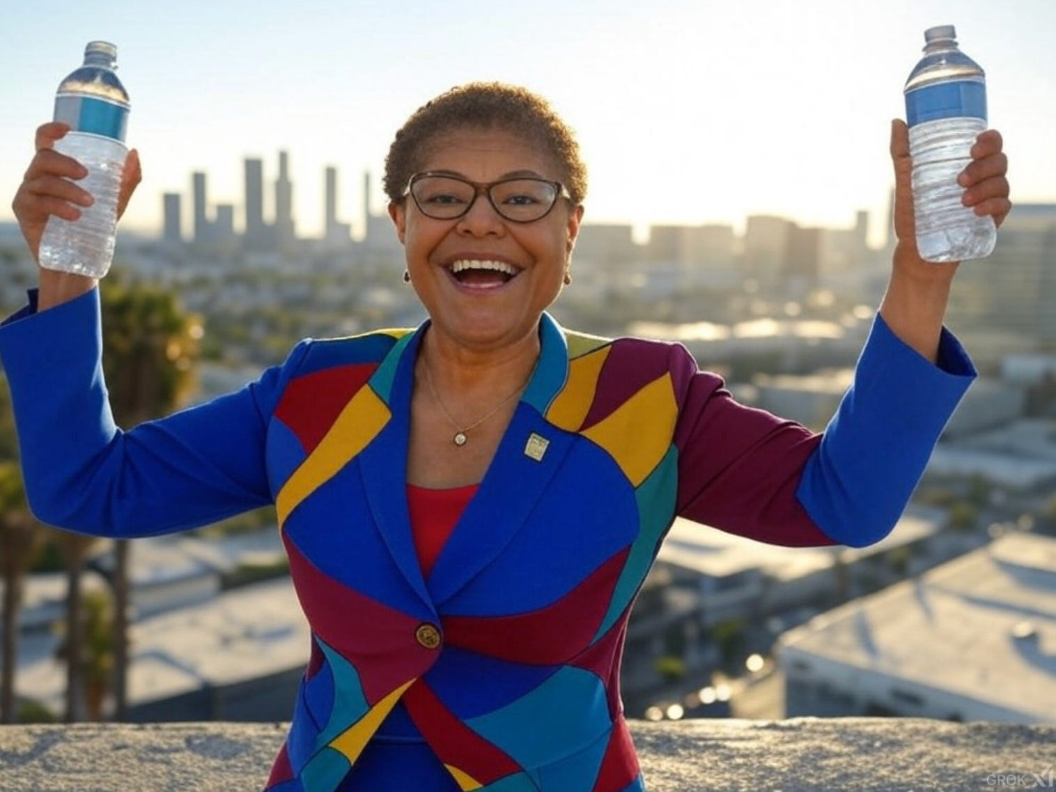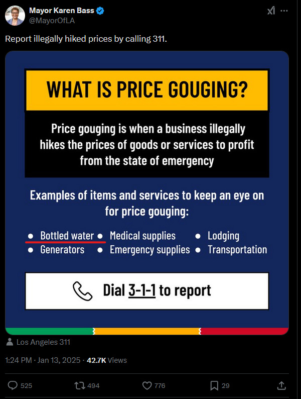 Following the outbreak of a dozen blistering wildfires in southern California–which have so far killed 28 people and scorched 60 miles of Los Angeles–mayor Bass has changed her tune. She’s issued no grandstanding statements about sustainability (that is, when she’s not ignoring the press entirely). But she has taken to Twitter, urging the public to report any business that engages in price gouging when selling essential supplies. The first product on the list? Bottled water.