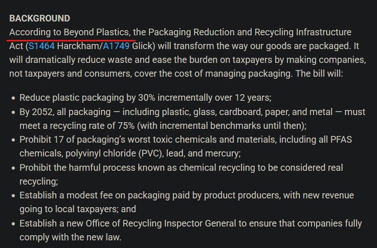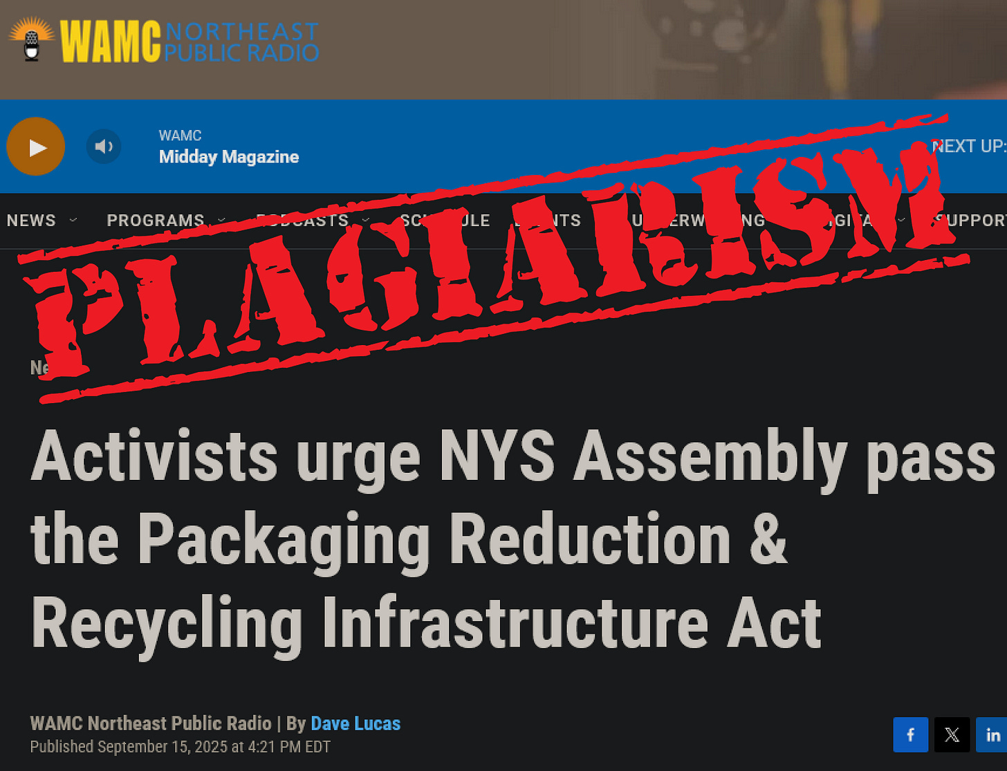 At the heart of the controversy is WAMC’s unattributed use of text from Beyond Plastics, an “NGO” with a habit of skirting nonprofit financial rules by laundering its donations through a tiny Vermont college. On September 15, WAMC Capital Region Bureau Chief David Lucas published a story titled Activists urge NYS Assembly pass the Packaging Reduction & Recycling Infrastructure Act. The short piece consists almost entirely of a single quote from a Beyond Plastics representative and a summary of the bill—plagiarized entirely from a Beyond Plastics press release.