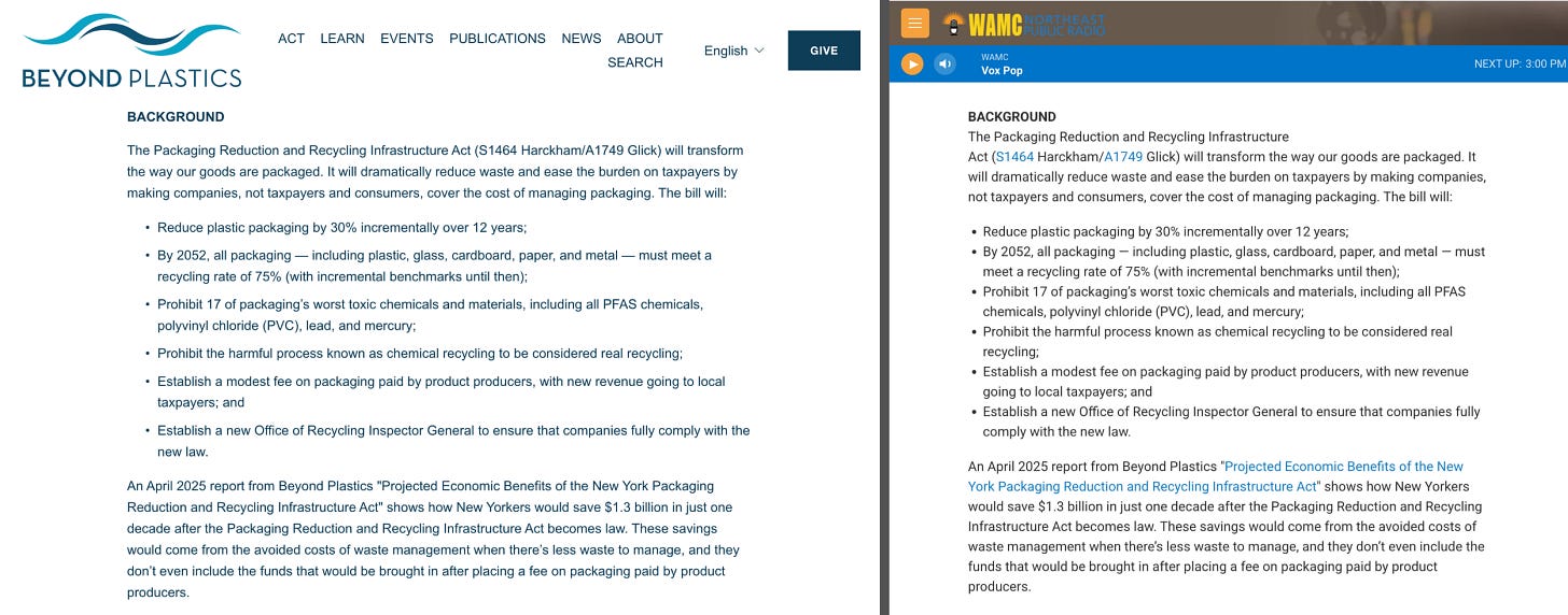 A Beyond Plastics’ press release set against WAMC’s coverage of the New York bill. The text in both documents is identical. Source.