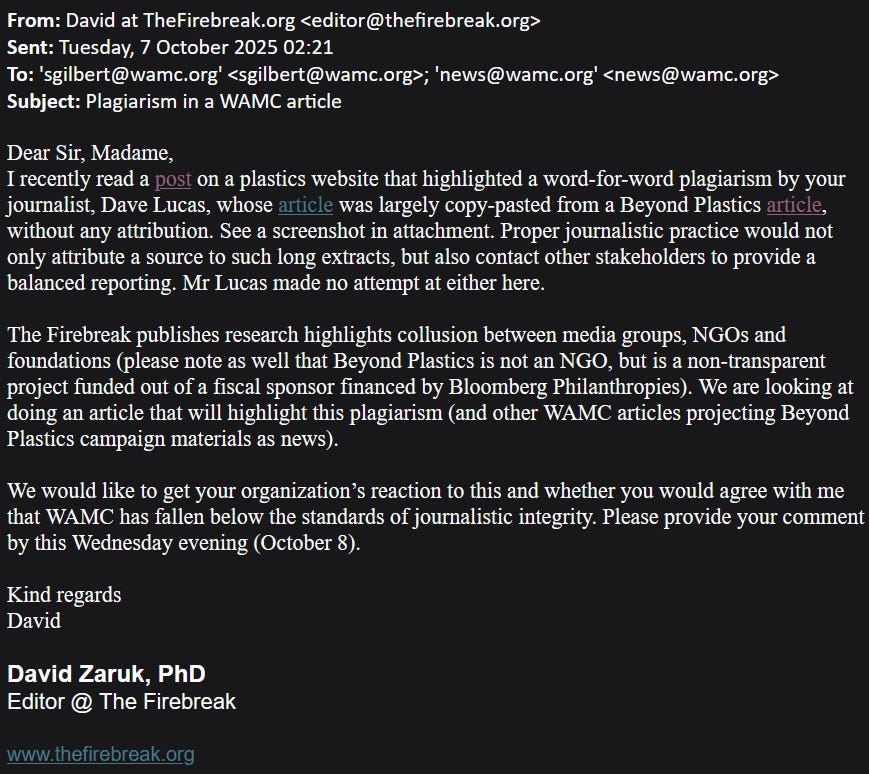 After The Firebreak learned of Lucas’ plagiarism, we contacted WAMC to inquire if the station was aware of his ethics breach and Beyond Plastics’ innovative accounting methods—especially since a significant chunk of its funding comes from a politically connected billionaire who backs multiple anti-plastic groups. These obvious conflicts of interest would trigger warning sirens for the leadership of any serious newsroom, yet we received no reply from WAMC’s news staff nor its CEO Sarah Gilbert.