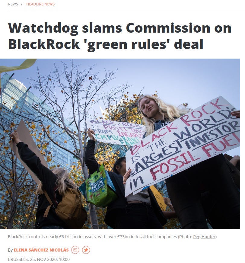 This BlackRock consulting contract caused a mini-scandal in 2021 and aroused the ire of the European ombudsman. At the time, the EUobserver website illustrated its review of the affair with a photo of a demonstration by “young people against the apocalypse” in front of Senator Feinstein’s office … in San Francisco.