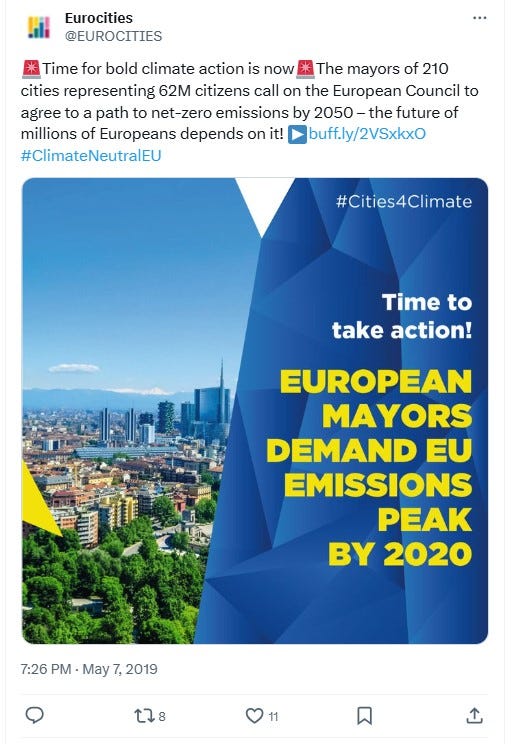 On May 7, two days before an “informal summit dedicated to the future of the EU” held in Romania, Eurocities was back at it. “The mayors of 210 cities representing 62 million citizens call on the European Council to agree on a path to net zero emissions by 2050,” tweets this organization, which at this time had an impressive staff of 78 people.