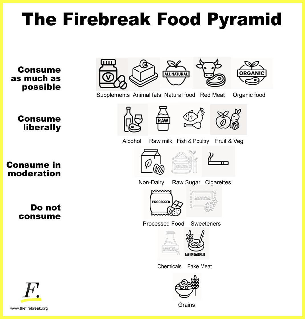 Since RFK Jr used his oligopoly in American health policy to rewrite the US Food Pyramid to serve his interest groups, followed by many others groups publishing their own versions, we decided to publish The Firebreak Food Pyramid. In order to generate more income for our supplement grifters, MAHA Moms and naturopaths, try to eat as much as possible of the foods at the top of the pyramid and try to avoid the foods at the bottom. Read the labels, get confused and then follow our grifters’ advice.
