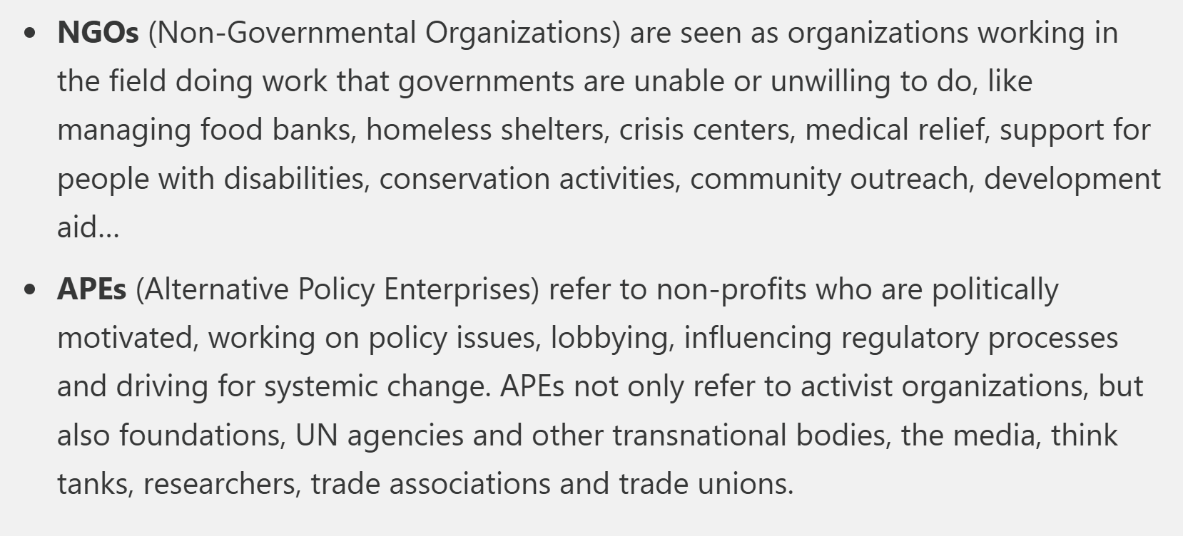 Keep in mind that there should be a distinction within the non-profit world between groups doing humanitarian work (legitimate NGOs) and activist lobby groups that try to effect policy change via fear campaigns. The latter cannot be considered NGOs, but rather, what I have termed: APEs (Alternative Policy Enterprises). See a Firebreak series on this. APEs are lobbying campaign groups, political activists trying to change public policy, and should not be considered under the same conditions as humanitarian NGOs working in the field (medical services, food banks, poverty alleviation, education support…).