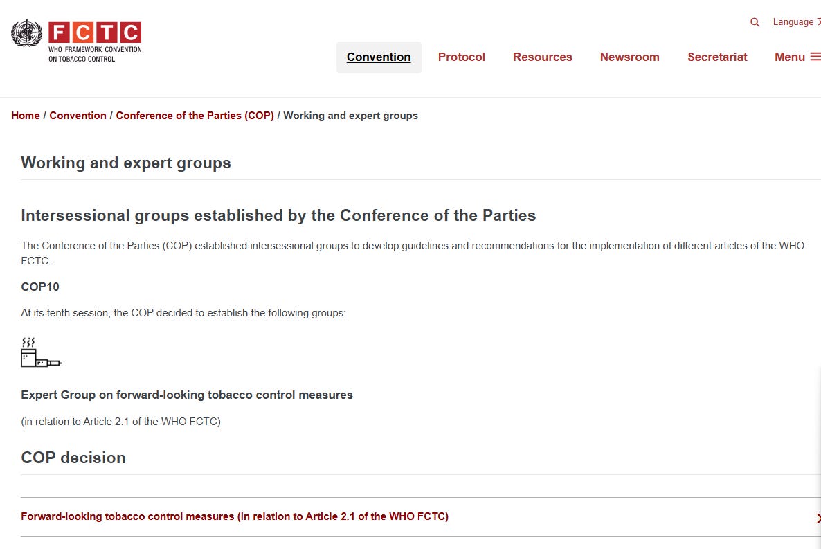 The WHO Framework Convention on Tobacco Control (FCTC) has various expert groups and working groups to prepare their documents for their regular Conference of the Parties (COP) conferences, but unlike agencies like IARC, they do not publish the members of these groups or the authors of their reports. Transparency is for the weak and the stupid.