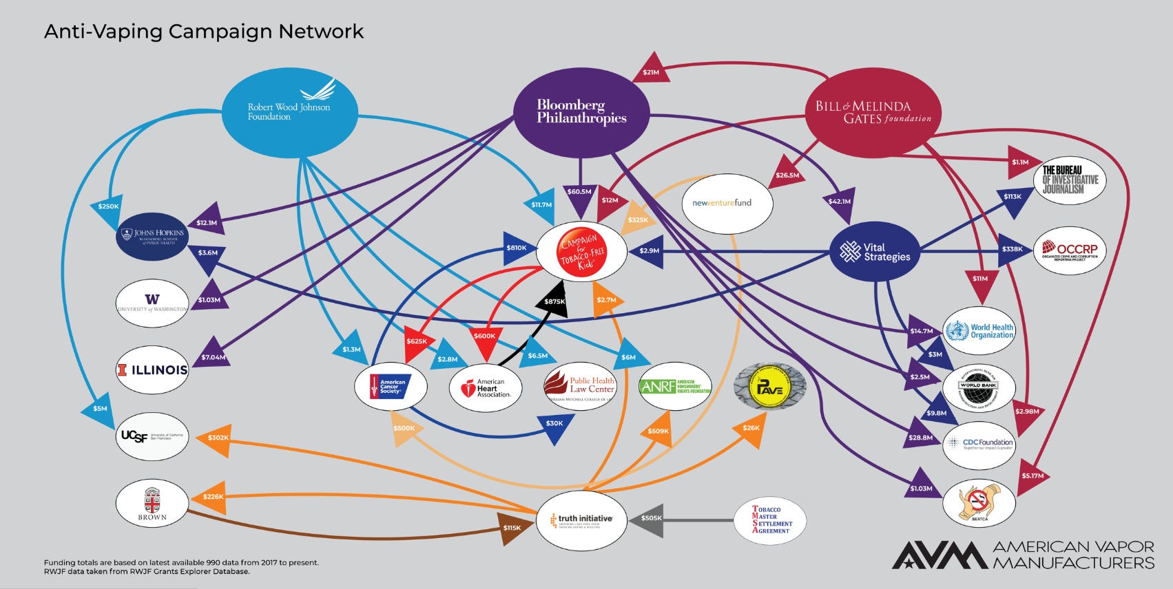 Several foundations are pumping millions into anti-nicotine, anti-vaping NGOs, researchers and lobby groups (see graphic below). These same foundations are large funders of WHO programs. Michael Bloomberg for example, has been rewarded for his millions in donations with the title of WHO ambassador (which he uses to be able to attend UN intergovernmental events as a quasi head of state). As the United States leaves the WHO, the Gates Foundation will become the largest WHO donor (mostly for vaccine programs via GAVI given that the WHO also refuses to work directing with vaccine manufacturers).
