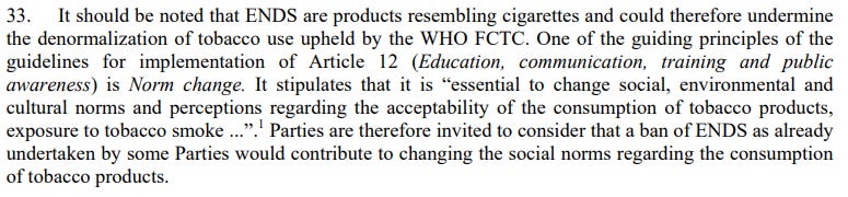 It is interesting to note, from their early days of lobbying against tobacco harm reduction, that the WHO’s strategy was to conflate the two. Nicotine is tobacco, vaping is smoking, and both must be stopped. In this 2012 document, they did recognize that this stigmatization of alternatives to tobacco products was a perception / normative battle that had little to do with scientific evidence.