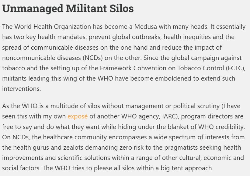 Very useful information and deserved harsh criticism of the lack of accountability of the WHO. You shed light on the inner wheeling and dealing in the technocratic shadows of the cabal of health apparatchiks, activist academics and Bloomberg Philanthropy operators that run the FTCT and impose a nicotine prohibitionist agenda on all non-pharmaceutic nicotine use.