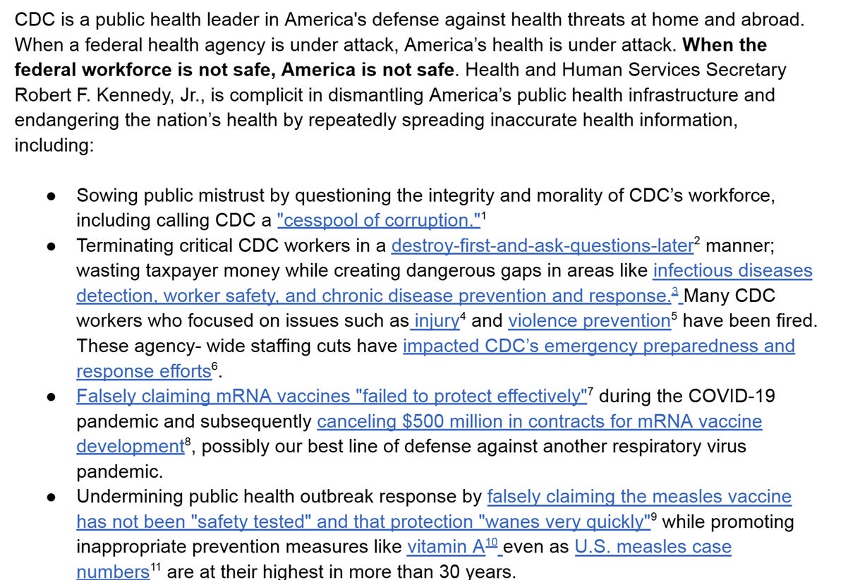 But it is not just RFK Jr’s putting political rhetoric and conspiracy theories over science and reality that has made him an agent of harm. His claims have also put CDC workers’ lives physically at risk.